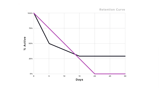 According to this retention curve, on day five retention is 50% – this means that half of the people who first used the product on January 1st came back and were active on January 6th. At first glance, it looks like a huge drop-off, but we can see that the curve stabilizes at 30% on day 15, so we can say that product A has a product-market fit for this particular cohort.