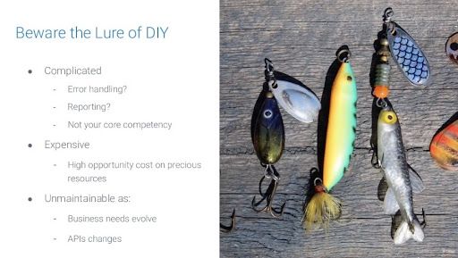 You should also beware of the lure of doing it all yourself. When I say do it yourself, here, I'm talking about building an integration.