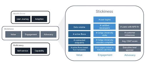 I'm going to focus mainly on the right-hand side of this image, but just broadly, we built a health score that is a combination of these user journey metrics and adoption metrics.