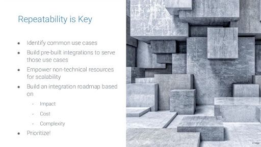 Think about this from a set of information silos, think about your integration roadmap in terms of how it's going to provide benefits, the impact, and the reach, the cost, and the complexity, and ultimately have a prioritized roadmap for your integrations and automations here around building these metrics.