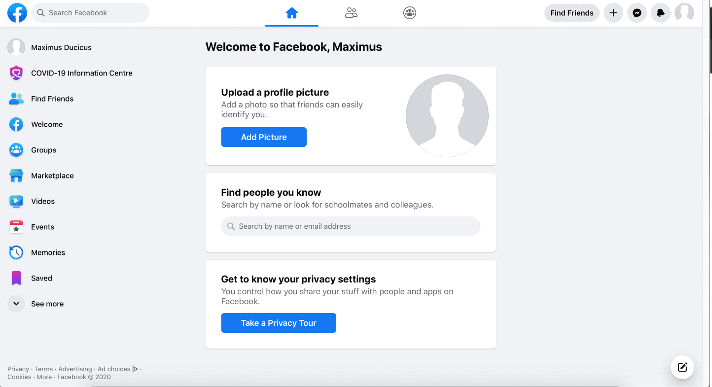 Similar to Slack, Facebook prompts you to complete a few basic first actions to complete your profile on the landing page.