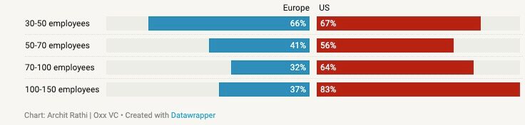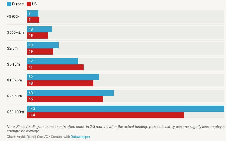 The average employee strength is very similar across Europe/US even as a company raises different amounts of capital.