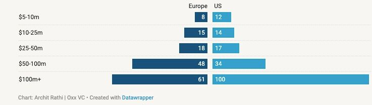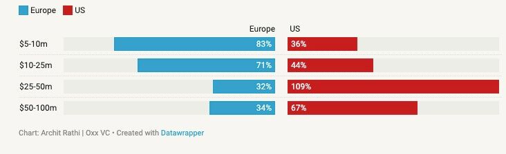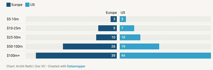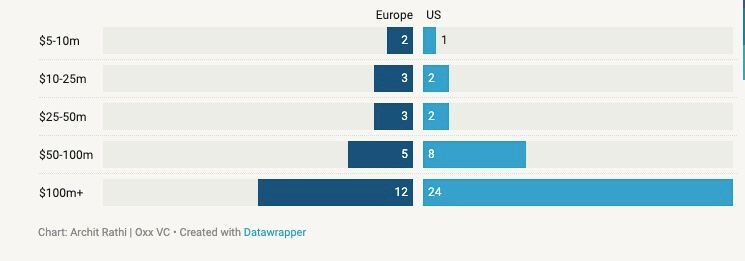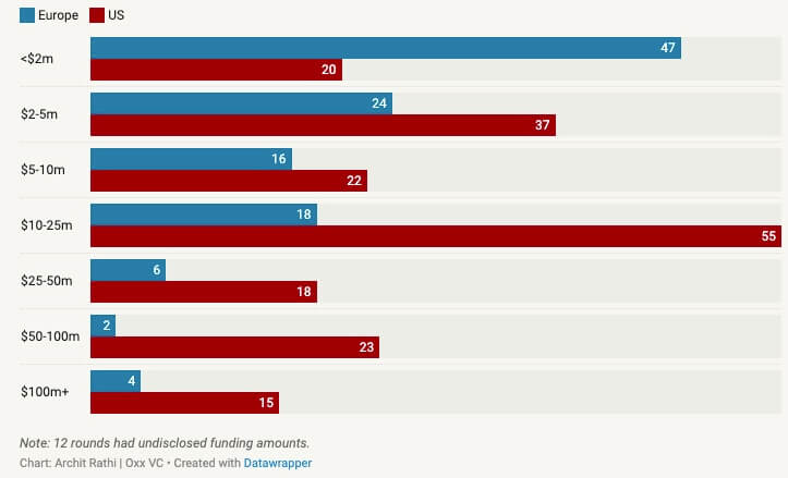 This could also mean that far fewer European companies raise $5-$25m rounds compared to the US because slower growing European businesses perhaps aren’t able to successfully fundraise.
