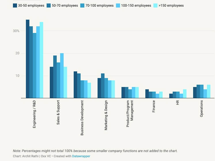 At the earliest stages of company evolution, it comprises 10-12% of your headcount but dips slightly to 8-9% by the time the company scales to >150 employees.