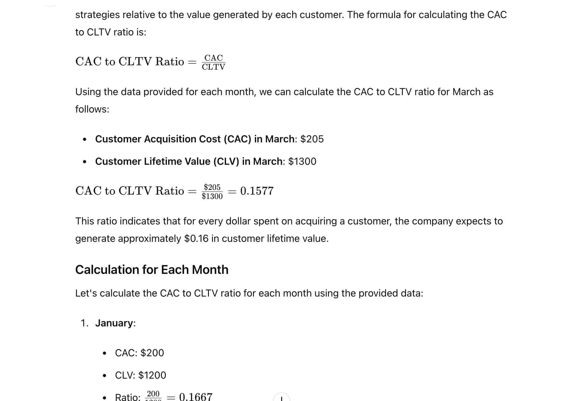You will often need to carry out calculations to help you make sense of the data you have. In the past this has taken up an awful lot of time. SaaS companies will often want to know the ratio between CAC and CLTV. We asked GPT-4o to tell us how to CAC to CLTV ratio and start calculating the ratios for the dummy data. Here's what this exciting tool came up with: