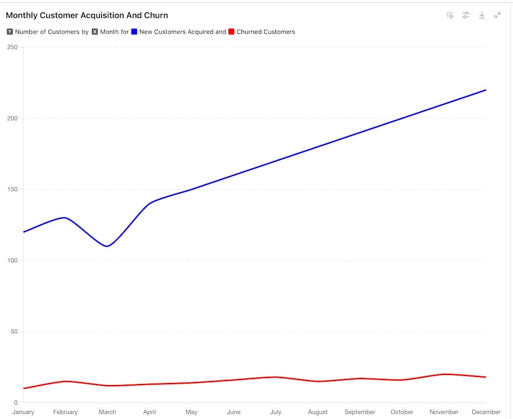 Here we asked GPT-4o to create a chart based on dummy data displaying a fictional SaaS org's churn vs acquisition over a year.