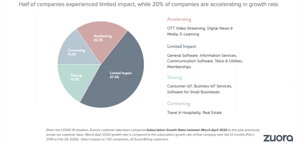 "Given Zuora works with over 1000 businesses, we went and looked at our data. What we found is that, in aggregate, subscription companies are proving to be resilient. We see that subscription businesses with this recurring revenue model are proving their resilience and half of our customer base experienced limited impact with 20% of them actually growing.