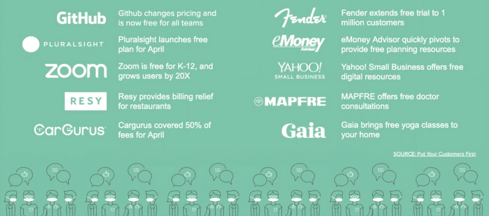 You'll notice that many of them are changing their pricing, creating new bundles, offering free trials, and giving payment relief. If you look at Zoom, they're driving adoption now with students and opening up their gates to put customers first.